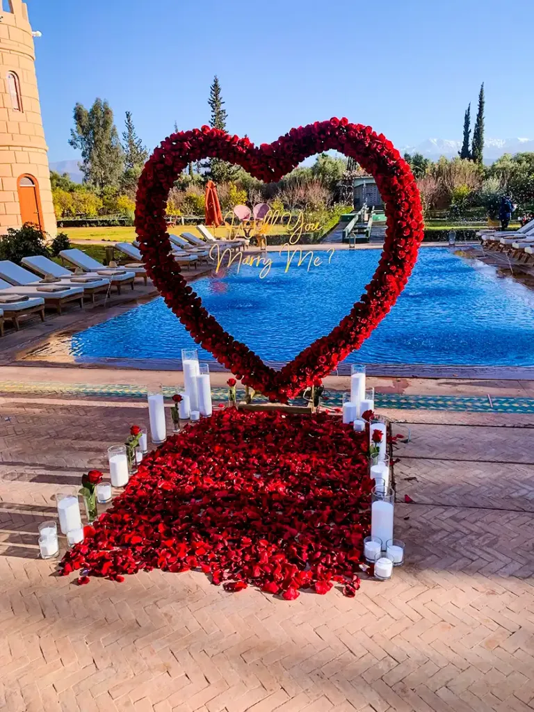 A bespoke proposal planner in Marrakech, we design heartfelt moments with photography, florals, musicians and private dinner options—whether in the Medina, a riad rooftop or the Agafay desert at golden hour.